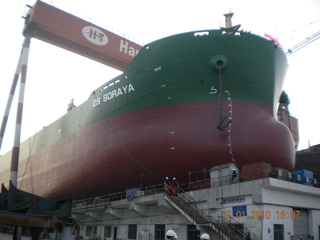 我司為巴哈馬船東Soraya Shipping Company Limited建造的57000噸散貨輪(船體號HT064)于2010年1月17日下午4:50在我司1號船臺順利下水,該船是我為巴哈馬船東建造的第一艘57000噸散貨輪,其建造十分順利,僅用了70天的船臺周期。武亦文總經(jīng)理,格雷格駐廠項目經(jīng)理Martin Adams,英勞駐廠代表參加了該儀式。