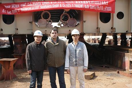 2010年3月17日,我司為PD船東建造的第13條57000DWT散貨輪(船體號(hào):HT033)于上午10:00在我司1#船臺(tái)2#滑道上臺(tái),PD項(xiàng)目駐廠經(jīng)理Babic,韓通船舶重工有限公司常務(wù)副總經(jīng)理陳林軍,英勞駐廠經(jīng)理王谷正參加了該儀式。