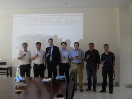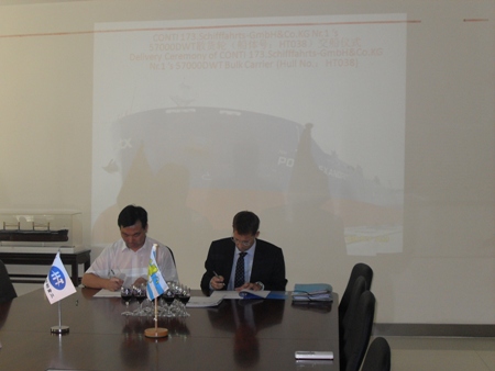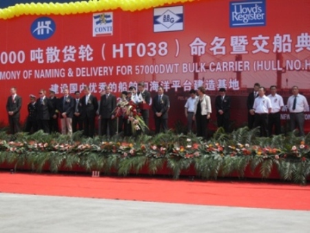 2010年9月7日江蘇新韓通船舶重工有限公司迎來了又一個值得慶祝和紀(jì)念的日子—HT038的命名及交船儀式。該57000DWT散貨輪為我司為德國CONTI 船東建造并交付的第二條散貨輪,該船被命名為“POS ALEXANDRIT”. CONTI 船東副總裁奧布梅拉先生和監(jiān)造公司BBG董事霍倫巴克先生和英國勞氏船級社中國區(qū)經(jīng)理Alan Swinbank 和Alan Williams參加了該儀式并發(fā)表講話。儀式結(jié)束后,船東船檢代表等參觀了該船,并給予很高的評價。2010年9月8日下午2:00在新韓通會議室簽訂了該船的交船文件。至此,該船成功交付。