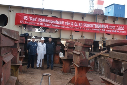 我司為德國船東建造的57000噸散貨輪(船體號:HT043)于2010年11月23日上午10:00在我司1號船臺舉行了上臺儀式,該船入LR船級社,計劃2011年4月30日交船。陳林軍常務(wù)副總及船東船檢代表參加了該儀式。