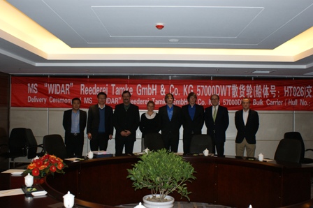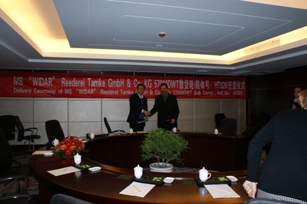 2011年1月6日,江蘇韓通船舶重工有限公司為PD建造的57000噸散貨輪(HT026)達(dá)到了交船狀態(tài),該船入英國勞氏船級(jí)社,被命名為“Widar”。下午4點(diǎn),在文景會(huì)議室總經(jīng)理武亦文先生與船東 Dirk Tamke先生簽訂了該船的交船文件。至此,該船成功交付。