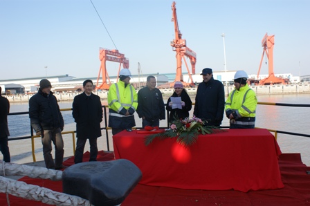 2011年1月25日下午,我司為PeterDoehle建造的57000噸散貨輪(船體號:HT024)在文景國際大酒店會議室舉行了命名及交船儀式。該船被命名為"TASMAN CASTLE",入LR船級社。常務(wù)副總陳林軍,船東代表Babic,中航技的代表洪昊舟參加了該儀式。2011年1月26日,三方共同簽署了交船協(xié)議。至此,該船成功交付。