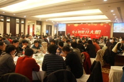 2011年1月27日晚,文景國(guó)際大酒店宴會(huì)大廳燈火璀璨,流光溢彩,由南通市海洋水建工程有限公司、江蘇韓通船舶重工有限公司、江蘇新韓通船舶重工有限公司、南通中冶船舶配套有限公司及文景國(guó)際大酒店共同舉辦,以“眾人劃槳開(kāi)大船”為主題的新春團(tuán)拜會(huì)正在舉行。歡快的音樂(lè)縈繞在耳畔,滿場(chǎng)的紅色襯托出喜慶的氣氛,讓整個(gè)會(huì)場(chǎng)籠罩在歡騰之中。