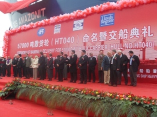 2011年4月7日上午10:18,我司為德國(guó)船東CONTI公司建造的57000噸散貨輪(HT040)“POS AMAZONIT”,在船東駐廠代表和LR船級(jí)社的協(xié)助下,在新韓通全體員工的努力下,成功命名,順利交付。自2009年以來(lái),我司已陸續(xù)為CONTI建造和交付了四艘57000噸散貨輪。