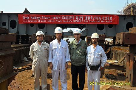 我司為大新船東建造的57000噸散貨輪(船體號:HT070)于2011年9月3日在我司1號船臺舉行了上臺儀式,該船入BV船級社。潘學軍副總及船東船檢代表參加了該儀式。