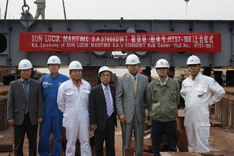 我司為韓國現(xiàn)代船東建造的57000DWT散貨輪(船體號(hào):HT57-108)于2011年10月15日上午9:00在我司1號(hào)船臺(tái)舉行了上臺(tái)儀式,該船入KR船級(jí)社。潘學(xué)軍副總及船東船檢代表參加了該儀式 |