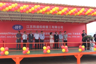 2014年9月29日江蘇韓通船舶重工有限公司迎來了又一個(gè)值得慶祝和紀(jì)念的日子—HT64-200命名及下水儀式。我司為大新船東建造的64000DWT散貨輪(HT64-200)在韓通1號(hào)船臺(tái)順利下水,入BV船級(jí)社。周義慶副總經(jīng)理,船東代表及船級(jí)社代表參加該儀式。