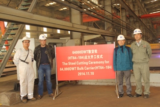 2014年11月10日,我司為 CONTI 船東建造的64000噸散貨輪(船體號:HT64-184)開工儀式在韓通新船體車間順利舉行,該船入LR船級社。董繼紅總經(jīng)理助理及船東、船檢代表參加該儀式。